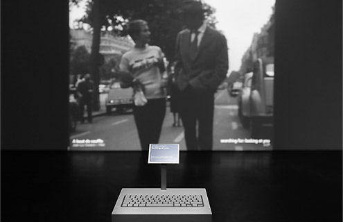 La sélection des mots-clés détermine donc le processus de remise en séquence de l’image et du son. En les diffusant bout à bout et en temps réel, un nouveau récit audiovisuel se fait jour pour le spectateur.