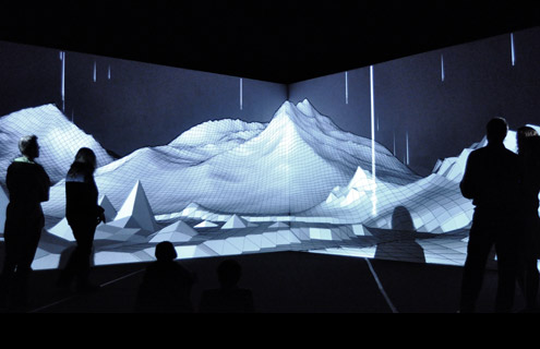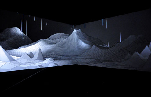 Inspiré par le volcan islandais qui perturba le trafic aérien international en avril 2010, Eyjafjallajokull en est une incarnation cartographique audiovisuelle, sous forme de mapping. Peint directement par l’artiste sur un grand mur, un paysage filaire se révèle lentement par de subtils jeux de lumière. Le spectateur est à la fois hypnotisé et perturbé par ces effets lumineux qui créent des illusions d’optique 3D sur une surface plane. Fasciné par ce rapport entre lumière et perception humaine, Joanie Lemercier cherche à sortir du rapport à l’écran rectangulaire plat.